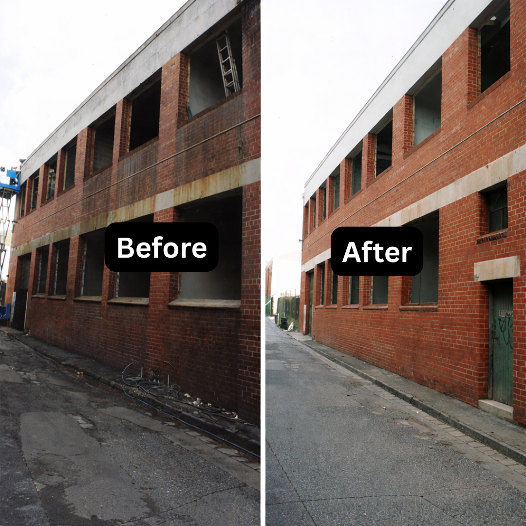 Delicate low-pressure cleaning of a heritage render facade, preserving historical integrity while eliminating years of industrial soot.